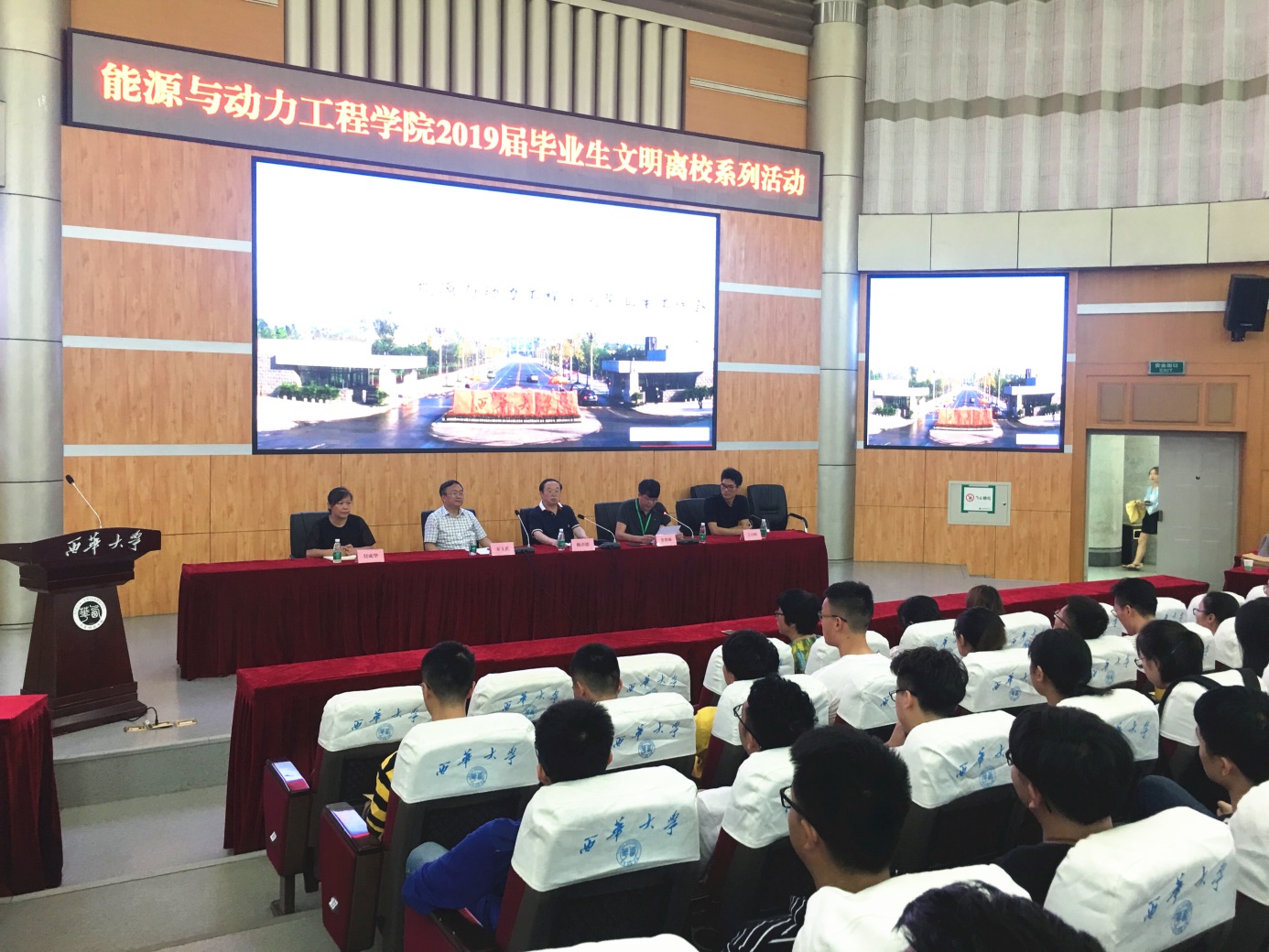 为浓厚“文明、和谐”的毕业季氛围,进一步做好2019届毕业生相关工作,2019年6月4日上午,能源与动力工程学院在四教报告厅召开以“爱国·爱校·爱自己——争做文明毕业生”为主题的毕业生工作会。学院领导班子全体成员、学生工作办公室主任、团委书记、毕业班班主任以及全体2019届毕业生参加会议。会议由学院党委副书记兼副院长罗世韡主持。