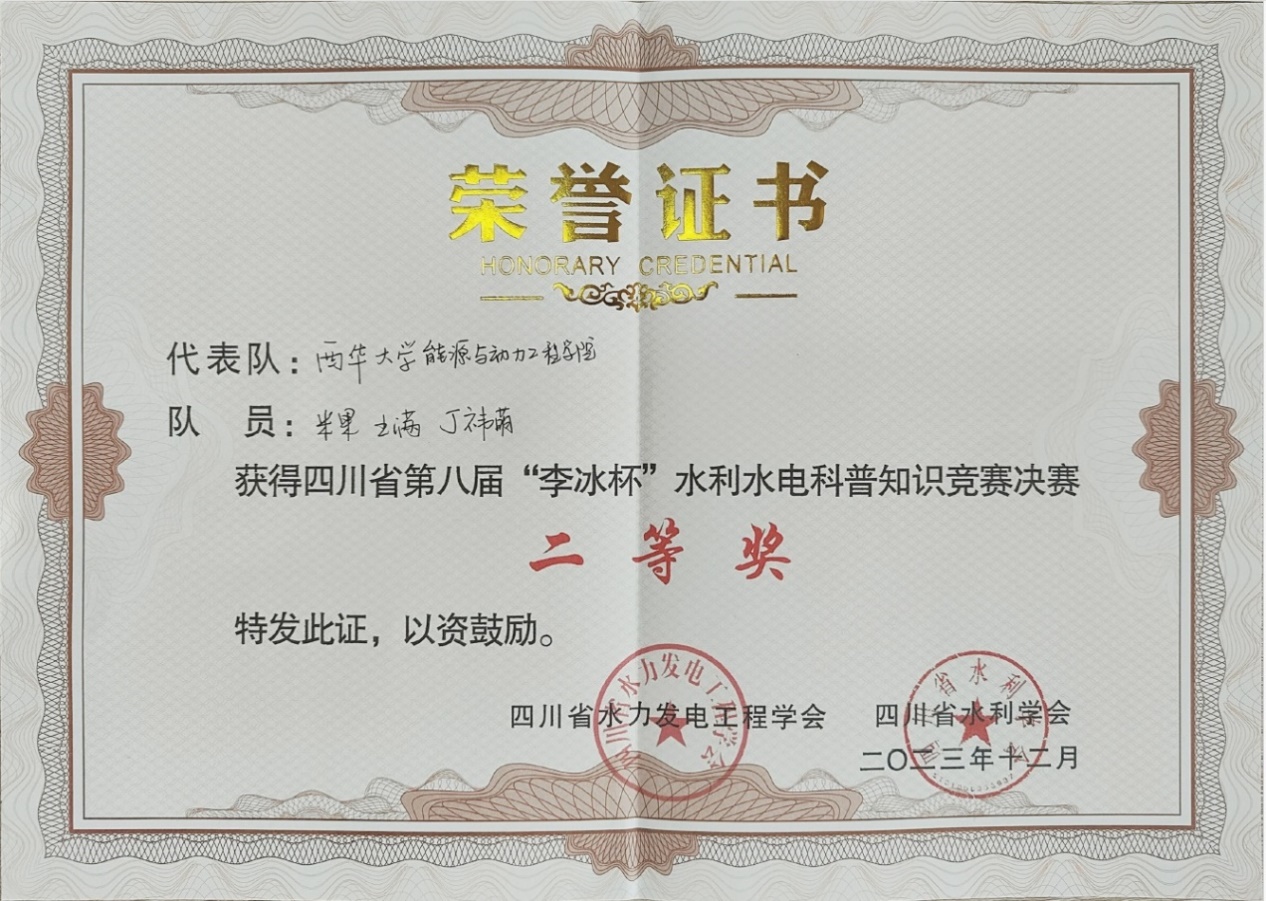 122日,由四川省水力发电工程学会与四川省水利学会联合举办的第八届“李冰杯”水利水电科普知识竞赛在四川大学望江校区圆满落下帷幕,来自四川大学、Betway体育西汉姆联、四川农业大学等七所高校的代表队参加了此次竞赛。经过激烈的角逐,我校代表队凭借扎实的知识储备和出色的团队协作最终获得二等奖的好成绩。