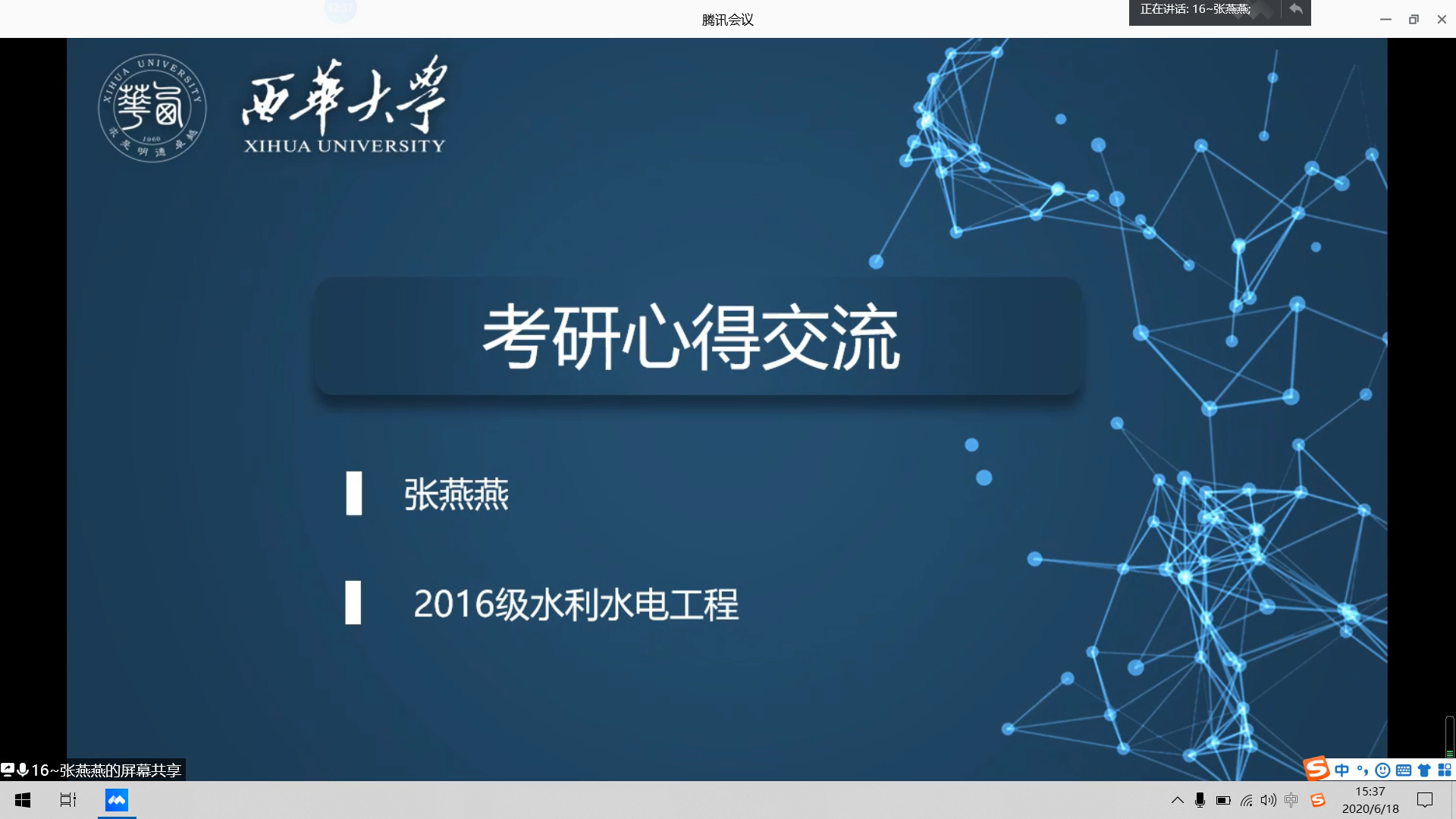 2016级水利水电工程专业的任明辉同学用诙谐幽默的PPT向大家分享了自己的日常生活,不只是学习优异,他还同时担任班级班长、团委学生会干部,加入主持人队伍、排球队以及创新实验室。他认为要想成功上岸,就要找到正确的方法,踏实努力地学习,坚持就是胜利;劳逸结合,注意身体健康。并且接地气地总结:七教是个好地方,与其在寝室里宅着不如出来走走,积极参加活动。