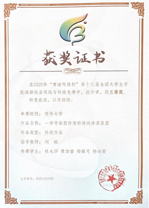 本届大赛自启动以来,吸引了包括清华大学、上海交通大学、浙江大学、西安交通大学、重庆大学等404所高校。最终,由我校能源与动力工程学院刘蛟老师指导,2018级水利水电工程专业学生杜永莎、黄泇睿、郑茹月、杨兴荣设计的项目“一种弯曲型防堵检堵的渗灌装置”获全国三等奖。