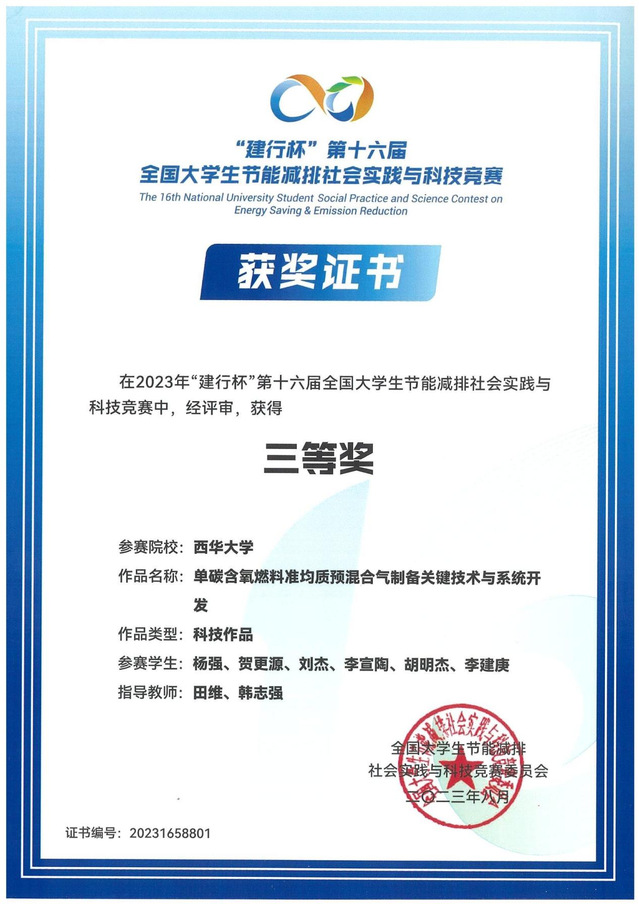 | 单碳含氧燃料准均质预混合气制备关键技术与系统开发 | 田维、韩志强 | 杨强、贺更源、刘杰、李宣陶、胡明杰、李建庚 | 全国三等奖 |