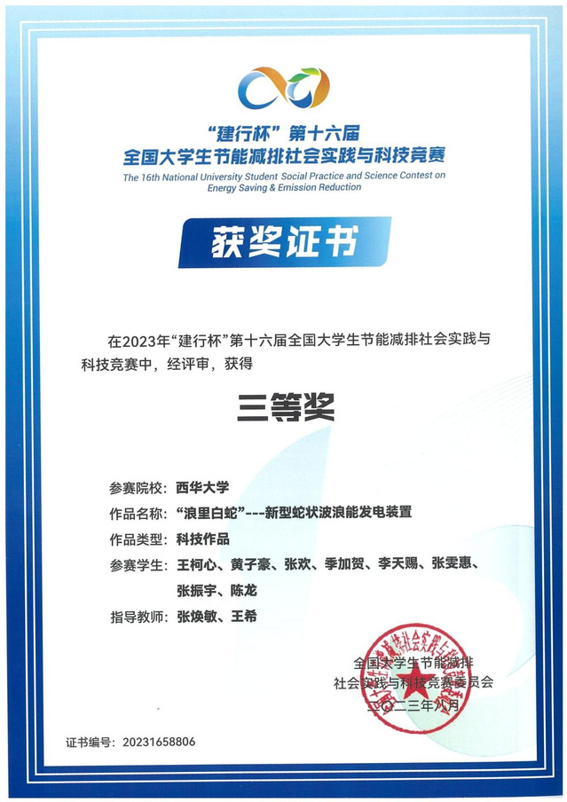 | “浪里白蛇”——新型蛇状波浪能发电装置 | 张焕敏、王希 | 王柯心、黄子豪、张欢、季加贺、李天赐、张雯惠、张振宇、陈龙 | 全国三等奖 |