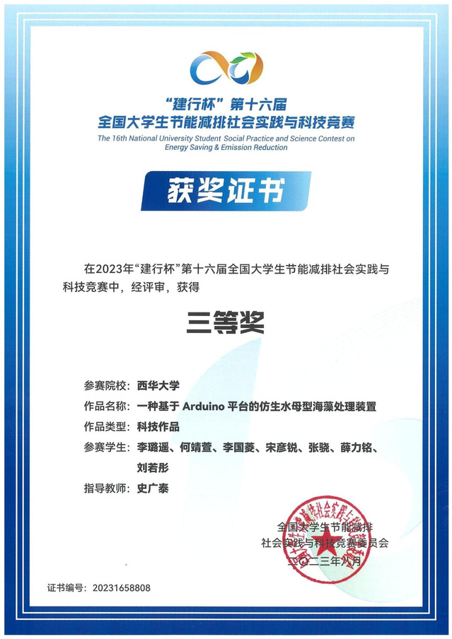 | 种基于Arduino平台的仿生水母型海藻监测装置 | 史广泰 | 李路遥、何靖萱、李国菱、宋彦锐、张骁、薛力铭、刘若彤 | 全国三等奖 |