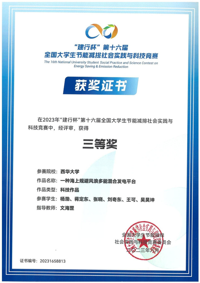 | 一种海上规避风多能混合发电平台 | 文海罡 | 杨渤、蒋定东、张晓、刘奇东、王可、吴昊坤 | 全国三等奖 |