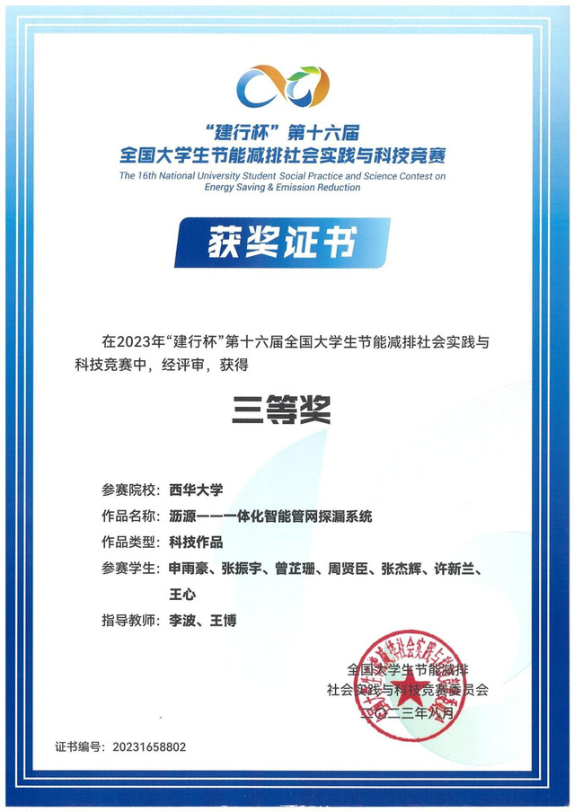 | 沥源——一体化智能管网探漏系统 | 李波、王博 | 申雨豪、张振宇、曾芷珊、周贤臣、张杰辉、许新兰、王心 | 全国三等奖 |