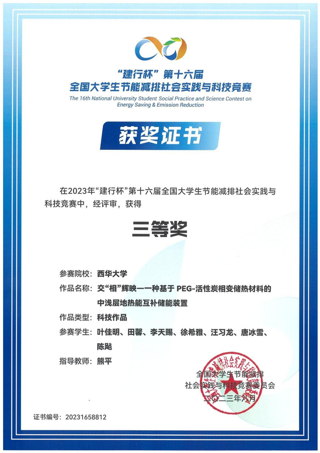 | 交“相”辉映—一种基于PEG-活性炭相变储热材料的中浅层地热能互补储能装置 | 熊平 | 叶佳明、田馨、李天赐、徐希雅、汪习龙、唐冰雪、陈飐 | 全国三等奖 |