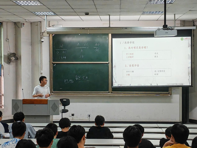 会议开始,三位研究生学长依次上台发言,分享了自己的考研心得和学习方法。他们为正在备战考研的同学们详细剖析了考研流程,以自身为例,分享了备考时间线和学习方法,将每门课程如何学习做了重点分享,向同学们分享了自己考研时的资料和视频课程,并在最后表达了对同学们成功上岸的美好祝愿,为同学们注入了一剂强心剂。会议最后,史广泰上台,他和同学们分享了自己考研时的感受和经验,重点讲解了本校研究生学点位及今后的发展方向。