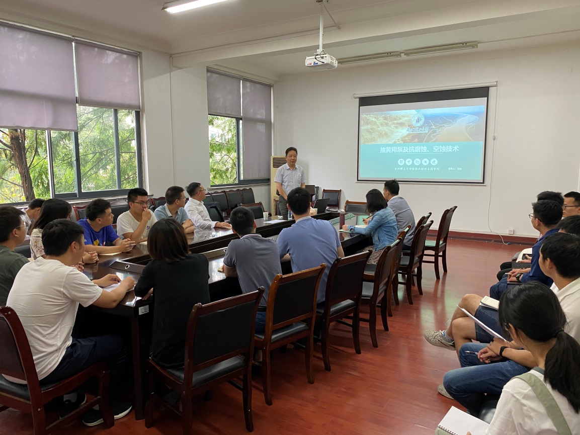 刘宜教授首先以“景泰川电灌工程”的黄河泥沙问题为背景,介绍了“规划设计不合理,建设标准低,部分泵站供水无保障”、“抽黄提灌用泵整体运行效率低、能耗高、工作寿命短、维修成本高”和“提灌泵机组产品科技含量低、维修及改造成本高”等抽黄泵站的突出问题,然后就磨蚀破坏的原因和机理做了深入介绍,最后从“减少泥沙进入进水流道和前池”、“提高水泵过流部件抗磨性能”和“对过流部件表面进行喷涂材料抗磨”等方面对水泵抗泥沙磨损的措施进行了详细的介绍,提出了抽黄泵站泥沙磨损的解决措施。报告结束后,刘宜教授深入浅出地回答了参会师生提出的问题。