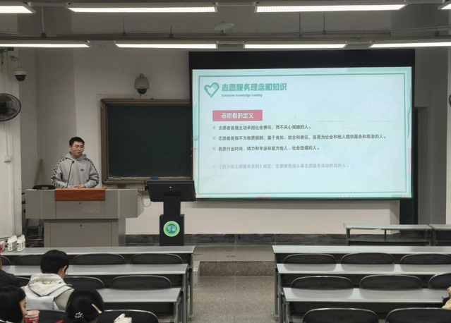 培训中,詹俊楠围绕“志愿服务的核心价值”,从志愿精神内涵切入,结合实例阐释“奉献、友爱、互助、进步”精神的实践意义。何宇鑫聚焦“角色定位与实践技巧”,详解沟通、协作及应急处理技能,并通过场景模拟互动,让同学们实操常见问题解决策略。