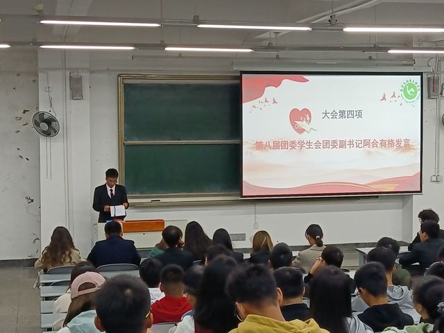 大会第三项,第八届团委学生会副书记阿合有格同学发言,首先,他表示了对上一届团委学生会的感谢,并对第八届团委学生会在接下来一年的工作提出整体规划,接着,对在座的团学成员提出具体要求,并代表第八届全体成员做出庄严承诺。