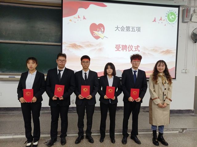 大会第四项,进行团委学生会干部、各协会会长受聘仪式,学工办主任张蓝月,院团委书记古羽加,辅导员李亚东、王希为团学干部颁发聘书并合影留念。