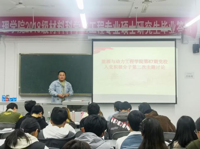 今年是中国共产党成立一百周年,习近平总书记在“七一”纪念大会上发表了重要讲话,指出“未来属于青年,希望寄予青年。一百年前,一群新青年高举马克思主义思想火炬,在风雨如晦的中国苦苦探寻民族复兴的前途。一百年来,在中国共产党的旗帜下,一代代中国青年把青春奋斗融入党和人民事业,成为实现中华民族伟大复兴的先锋力量。新时代的中国青年要以实现中华民族伟大复兴为己任,增强做中国人的志气、骨气、底气,不负时代,不负韶华,不负党和人民的殷切期望!”为进一步加深学员们对习近平总书记重要讲话精神的学习和感悟,增强新时代青年的主人翁意识,2021年10月24日,能源与动力工程学院第47期党校入党积极分子们在6C209开展了主题为“新时代青年怎样新时代中国青年怎样做才能不负时代,不负韶华,不负党和人民的亲切期盼”。
