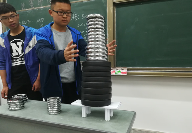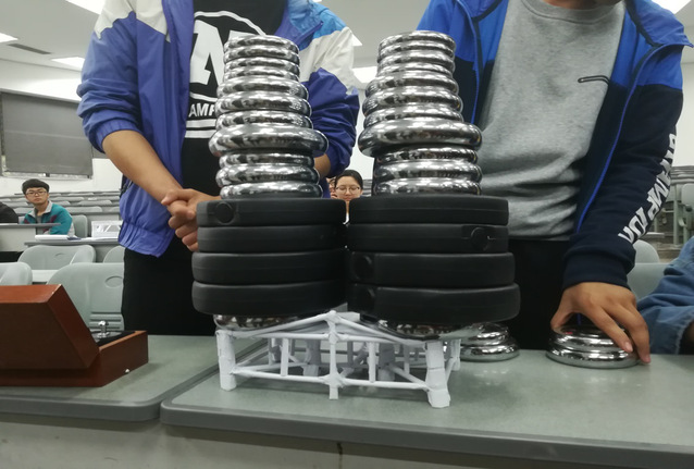 在正式比赛之后,还进行了挑战赛,即认为自己制造的桥梁在不受时间限制的情况下还可以获得更大承重的参赛队伍参加了挑战赛。最终第十组,让在场的所有人都为之惊叹,她们的桥梁在承受了主办方准备的所有哑铃片的重量后,依旧十分坚固。