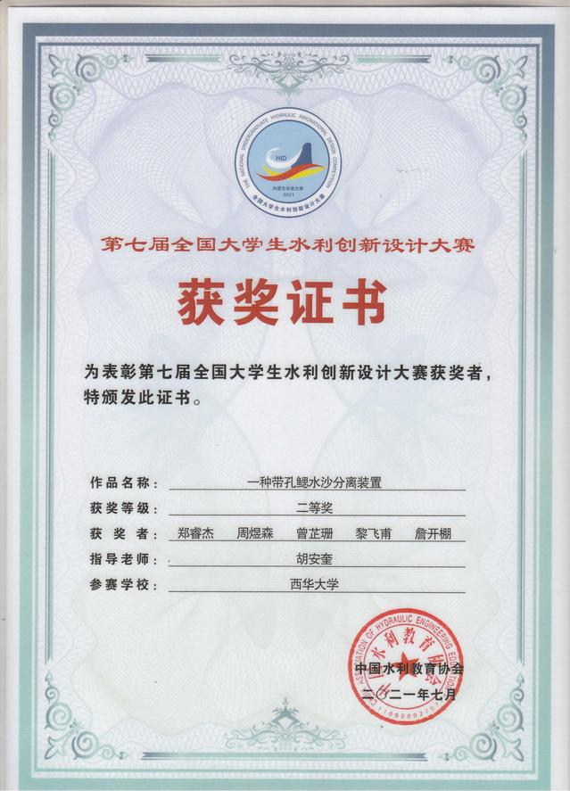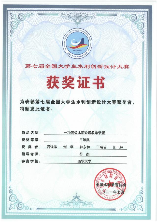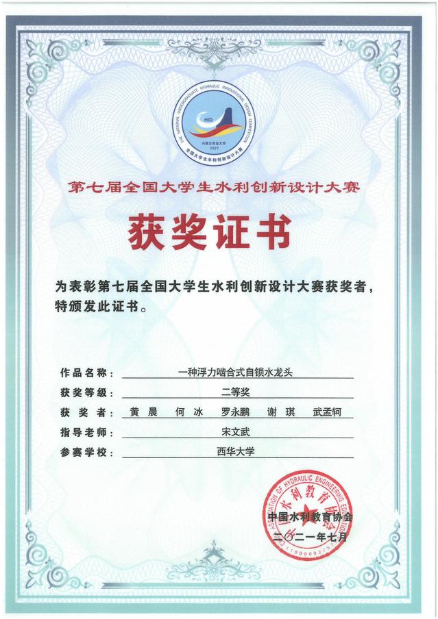 全国大学生水利创新设计大赛每两年举办一次,迄今已成功举办七届,受到各涉水高校的高度重视,有水利学科竞赛奥赛之称,参赛高校数逐届增多,影响力逐届提升。本次大赛的主题为“新阶段 新水利”,利用多种技术围绕新阶段水利高质量发展进行实物作品的创新设计与制作,注重节水优先、人水和谐、可持续发展及新技术的应用。本届大赛共有94所高校的254组作品报名参加。经过经过校级评选、专家评审、作品展示等环节的激烈角逐,最终“一种浮力啮合式自锁水龙头”和“一种带孔鳃水沙分离装置”和荣获全国二等奖,“一种高效水面垃圾收集装置”荣获全国三等奖。