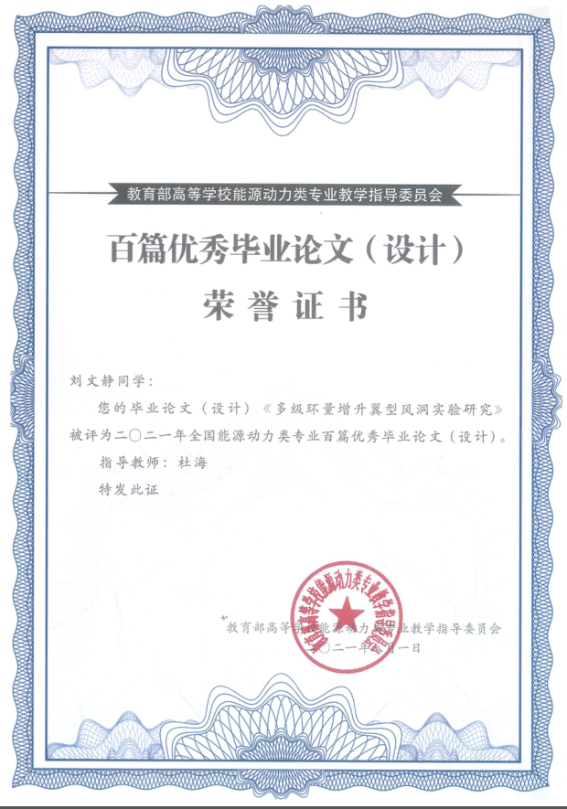 近日,由教育部高等学校能源动力类专业教学指导委员会主办的首届全国能源动力类专业优秀本科毕业论文(设计)在线展示交流活动在山东大学落下帷幕。经专家评审,我校能源与动力工程学院能源与动力工程专业刘文静同学的毕业论文《多级环量增升翼型风洞实验研究》被评为2021年全国能源动力类专业百篇优秀毕业论文(设计),论文的指导教师为杜海副教授。