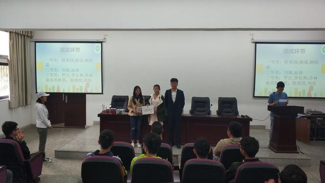 2018年4月10日中午12时,能源与动力工程学院第一届“纸桥承重”创意比赛颁奖仪式于1B-201顺利举行。学院党委书记罗世韡、团委书记李亚东、团委学生会主席张旭到场参加。