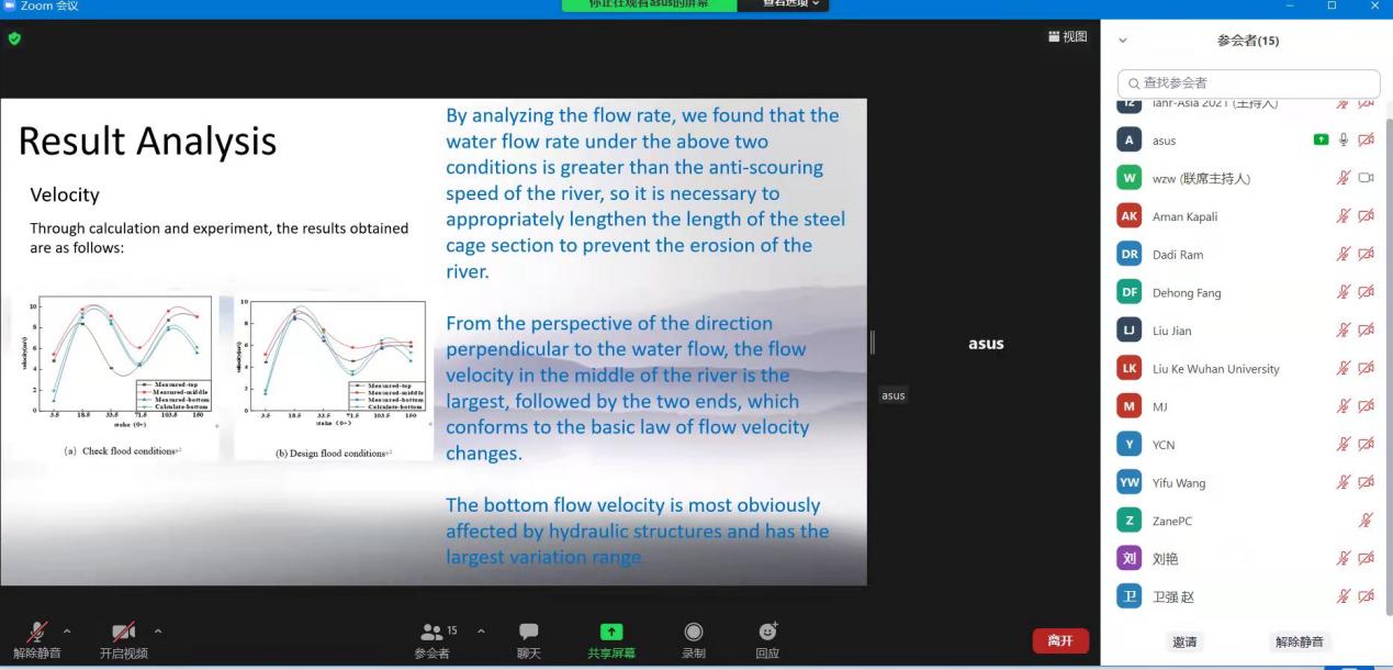 能源与动力工程学院部分教师以及硕士研究生王冬、徐洋、邵爽受邀参加了本次大会,并分别作了题为“Pressure pulsation analysis of runner and draft tube of pump turbine under different working conditions”、“Analysis and research on sluice gate flow of a hydropower station under different working conditions”、“Analysis of deformation characteristics of flood gates of runoff hydropower stations under different operating conditions in case of frequent floods”的主题报告,报告受到了国内外同行的关注。