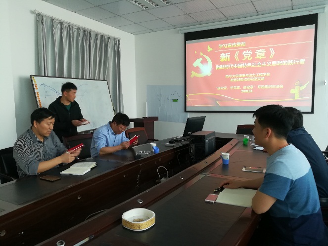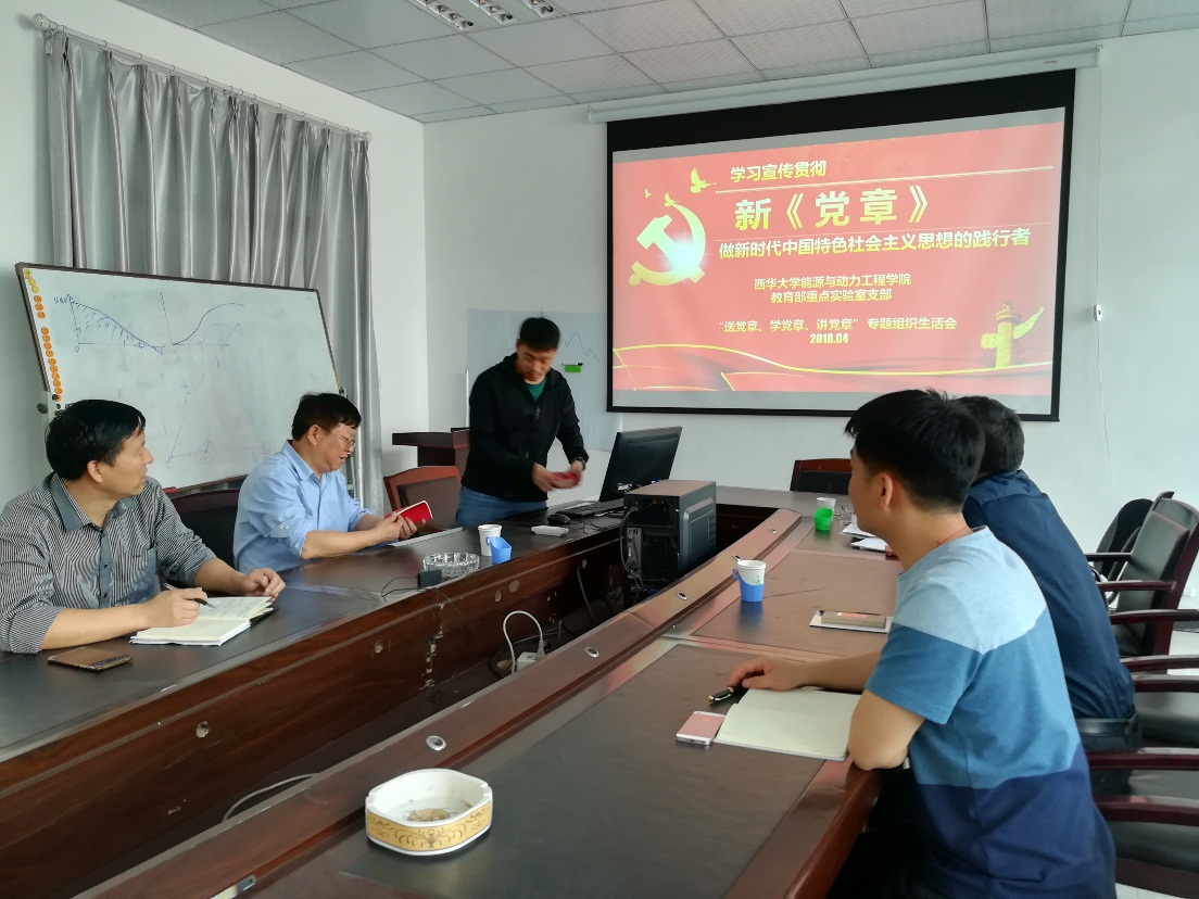 为进一步学习宣传贯彻党的十九大精神,结合“两学一做”学习教育常态化制度化的要求,进一步提升党员对党章的理解, 4月19日上午,能源与动力工程学院教育部重点实验室党支部组织开展了“送党章·学党章·讲党章”专题组织生活会,会议由党支部书记姚兵同志主持,支部党员参加了此次活动。