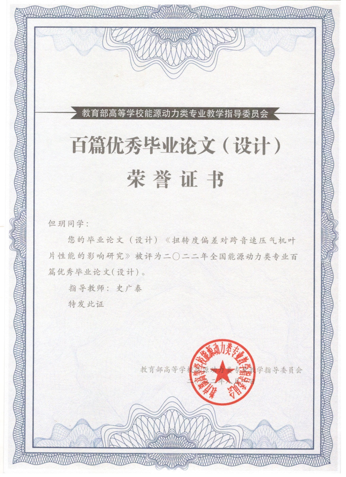 近日,由教育部高等学校能源动力类专业教学指导委员会主办的第二届全国能源动力类专业优秀本科毕业论文(设计)评选活动在天津大学落下帷幕。经专家委员会评审和教育部高等学校能源动力类专业教学指导委员会审议通过,我院能源与动力工程专业2022届毕业生但玥同学的毕业论文《扭转度偏差对跨音速压气机性能的影响研究》被评为2022年全国能源动力类专业百篇优秀毕业论文(设计),论文的指导教师为史广泰副教授。