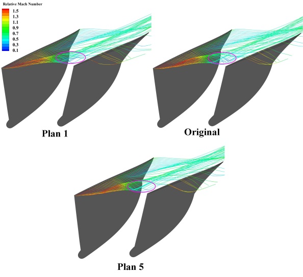 该论文以跨音速压气机转子Rotor37作为研究对象,基于100组实测扭转度偏差,从中选取出5组典型数据(Plan 1-Plan 5)应用于Rotor37转子,对13个叶片截面进行扭转,以创建偏差模型,进一步利用CFD软件对偏差叶片及原模型叶片进行全工况计算,通过对比分析获得扭转度偏差对Rotor37性能及典型工况流场的影响规律。研究结果发现:随着扭转度偏差的减小,气流通流能力削弱,叶片等熵效率及总压比特性曲线向小流量工况移动,堵塞流量及近失速点流量均减小;同时,扭转度偏差减小,压气机稳定裕度逐渐增大,最大变化率可达到12.288%;另外,当扭转度偏差减小时,设计工况及近失速工况时的激波位置延后,且截面熵值减小,叶顶泄漏涡及泄漏流的相互干扰作用减弱,损失减小,即在扭转度公差范围内,随着扭转度偏差减小,通道内气流流动得到一定的改善。