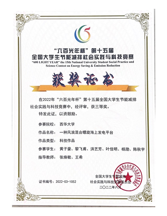 本届大赛自启动以来,吸引了包括清华大学、天津大学、厦门大学、哈尔滨工业大学等共有623所高校报名参加,其中还包括13所境外高校,有效作品达6218件。我校参赛作品首先历经校赛选拔脱颖而出,共有15个项目代表Betway体育西汉姆联参加国赛,最终由能源于动力工程学院张焕敏、王希老师指导,黄子豪、黎飞甫、洪艺芳、叶佳明、杨渤、陈秋宇同学参与设计的作品《一种风浪混合螺旋海上发电平台》获全国三等奖;由能源与动力工程学院胡安奎老师指导,唐庚、黄英、周俊、杨振宇、曾柏皓同学参与设计的作品《一种新型柴油机颗粒捕集器》获全国三等奖;由能源与动力工程学院胡安奎老师指导,王柯心、黎飞甫、吴凯歌、吴佳贻、张靳骁、赵旭阳、田馨同学参与设计的作品《道路尾气“杀手”》获全国三等奖。