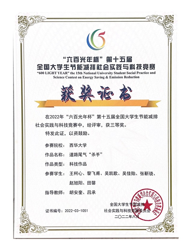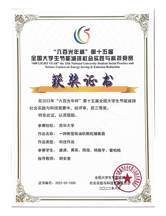 近日,由教育部高等教育司主办、教育部高等学校能源动力学科教学指导委员会承办的“六百光年杯”第十五届全国大学生节能减排社会实践与科技竞赛在天津大学举行。经过校级评选、专家评审等多个环节的激烈评选后,西华学子再创佳绩,荣获三等奖3项,能源与动力工程学院精心组织竞赛,表现突出,获优秀组织奖。
