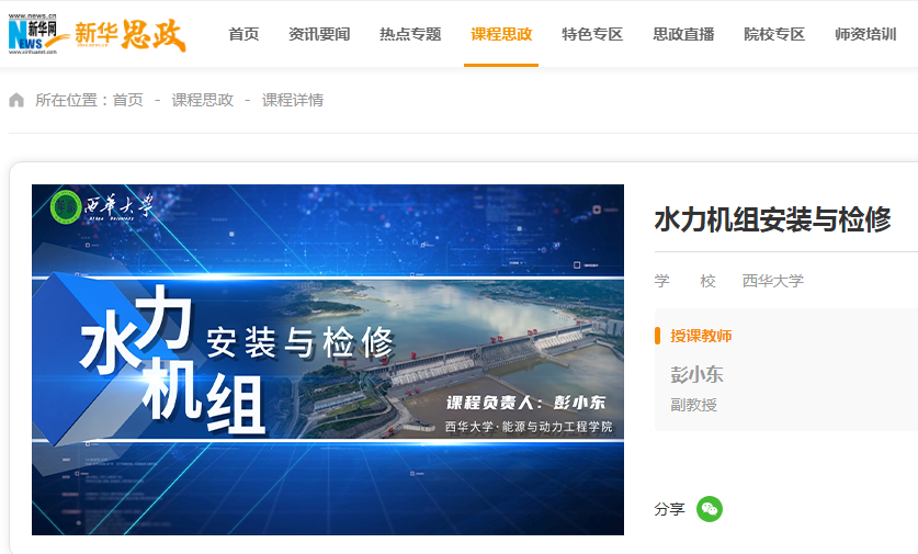 近日,能源与动力工程学院彭小东副教授团队的《水力机组安装与检修》课程思政优秀案例成功在“新华思政”平台上线,面向全国进行开放共享。